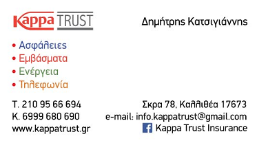 Αξιοπιστία, φερεγγυότητα, σεβασμός, ποιότητα, είναι οι αρχές πάνω στις οποίες δημιουργήθηκε η Kappa TRUST Insurance, παρέχοντας ασφαλιστικές υπηρεσίες σε όλους τους κλάδους καλύπτοντας ανάγκες από τη μικρότερη μέχρι τη μεγαλύτερη.