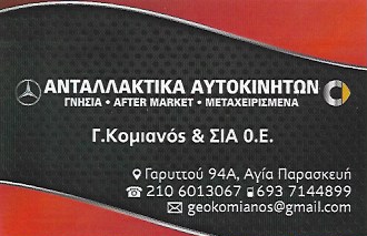 Ανταλλακτικά-Αξεσουάρ Γ ΚΟΜΙΑΝΟΣ ΚΑΙ ΣΙΑ ΟΕ-ΑΝΤΑΛΛΑΚΤΙΚΑ ΑΥΤΟΚΙΝΗΤΩΝ ΑΓΙΑ ΠΑΡΑΣΚΕΥΗ Γαρυττού 94Α Αγία Παρασκευή Πληροφορίες Επιχείρησης: Γαρυττού 94Α Αγία Παρασκευή 15343 2106013067 6937144899 Κος Κομιανός 35.2015175 24.1380312 627 Περιγραφή Επιχείρησης: Γ ΚΟΜΙΑΝΟΣ & ΣΙΑ ΟΕ Ανταλλακτικά Αυτοκινήτων