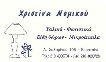 Είδη σπιτιού ΝΟΜΙΚΟΥ ΧΡΙΣΤΙΝΑ-ΥΑΛΙΚΑ ΚΕΡΑΤΣΙΝΙ-ΟΙΚΙΑΚΑ ΕΙΔΗ ΚΕΡΑΤΣΙΝΙ Λεωφόρος Σαλαμίνος 106 Κερατσίνι Πληροφορίες Επιχείρησης: Λεωφόρος Σαλαμίνος 106 Κερατσίνι 18757 2104000704 Κα Νομικού 35.2015175 24.1380312 469 Περιγραφή Επιχείρησης: ΧΡΙΣΤΙΝΑ ΝΟΜΙΚΟΥ Οικιακός Εξοπλισμός Υαλικά -Φωτιστικά-Είδη Δώρων