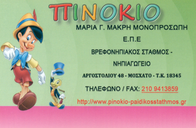Παιδικοί σταθμοί ΠΙΝΟΚΙΟ-ΠΑΙΔΙΚΟΣ ΣΤΑΘΜΟΣ ΜΟΣΧΑΤΟ Αργοστολίου 48 Μοσχάτο Πληροφορίες Επιχείρησης: Αργοστολίου 48 Μοσχάτο 18345 2109413859 Κα Μακρή 35.2015175 24.1380312 335 Περιγραφή Επιχείρησης: ΠΙΝΟΚΙΟ Παιδικός Σταθμός