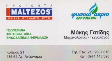 Ηλιακά-Θέρμανση-Ψύξη ΜΑΛΤΕΖΟΣ ΗΛΙΑΚΑ-ΗΛΙΑΚΑ-ΚΛΙΜΑΤΙΣΜΟΣ ΑΓΙΟΙ ΑΝΑΡΓΥΡΟΙ Κύπρου 21 Άγιοι Ανάργυροι Πληροφορίες Επιχείρησης: Κύπρου 21 Άγιοι Ανάργυροι 13561 2102637616 6977595255 Κος Γατίδης 38.0289811 23.7152515 1245 Περιγραφή Επιχείρησης: ΜΠΑΝΟΣ Α-ΓΑΤΙΔΗΣ ΟΕ ΜΑΛΤΕΖΟΣ ΗΛΙΑΚΑ Ηλιακά-Θέρμανση-Ψύξη