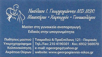 Μαιευτήρες-Γυναικολόγοι ΝΙΚΟΛΑΟΣ ΓΕΩΡΓΟΓΙΑΝΝΗΣ-ΓΥΝΑΙΚΟΛΟΓΟΙ ΠΕΙΡΑΙΑΣ Πραξιτέλους 221 Πειραιάς Πληροφορίες Επιχείρησης: Πραξιτέλους 221 Πειραιάς 18532 2104190301 6932560070 Κος Γεωργογιάννης 35.2015175 24.1380312 658 Περιγραφή Επιχείρησης: ΝΙΚΟΛΑΟΣ ΓΕΩΡΓΟΓΙΑΝΝΗΣ Μαιευτήρ Χειρουργός Γυναικολόγος https://www.georgogiannis-nikos.gr/