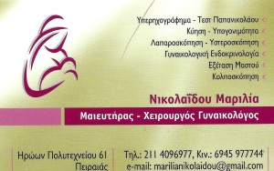 ΝΙΚΟΛΑΪΔΟΥ ΜΑΡΙΛΙΑ Μαιευτήρας-Χειρουργός Γυναικολόγος Υπερηχογράφημα-Τεστ Παπανικολάου Κύηση-Υπογονιμότητα Λαπαροσκόπηση-Υστεροσκόπηση Γυναικολογική Ενδοκρινολογία Εξέταση Μαστού Κολποσκόπηση