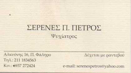 Ψυχίατροι ΣΕΡΕΝΕΣ ΠΕΤΡΟΣ-ΨΥΧΙΑΤΡΟΙ ΠΑΛΑΙΟ ΦΑΛΗΡΟ Αλκυόνης 16 Παλαιό Φάληρο Πληροφορίες Επιχείρησης: Αλκυόνης 16 Παλαιό Φάληρο 17561 2111834563 6937272424 Κος Σερενές 678 Περιγραφή Επιχείρησης: ΣΕΡΕΝΕΣ ΠΕΤΡΟΣ ΨΥΧΙΑΤΡΟΣ