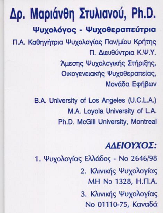 Ψυχολόγοι ΣΤΥΛΙΑΝΟΥ ΜΑΡΙΑΝΘΗ-ΨΥΧΟΛΟΓΟΙ ΑΘΗΝΑ Ευρυδάμαντος 18 Αθήνα Πληροφορίες Επιχείρησης: Ευρυδάμαντος 18 Αθήνα 11745 2109329124 6944536253 Κα Στυλιανού Μαριάνθη 37.956586 23.7180987 963 Περιγραφή Επιχείρησης: ΣΤΥΛΙΑΝΟΥ ΜΑΡΙΑΝΘΗ Ψυχολόγος