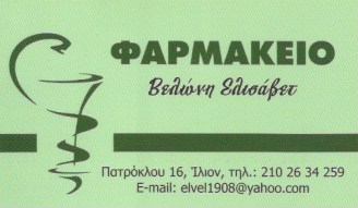 Φαρμακεία ΒΕΛΩΝΗ ΕΛΙΣΑΒΕΤ-ΦΑΡΜΑΚΕΙΑ ΙΛΙΟΝ Πατρόκλου 16 Ίλιον Πληροφορίες Επιχείρησης: Πατρόκλου 16 Ίλιον 13122 2102634259 35.2015175 24.1380312 377 Περιγραφή Επιχείρησης: ΒΕΛΩΝΗ ΕΛΙΣΑΒΕΤ Φαρμακείο