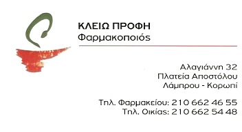 Φαρμακεία ΚΛΕΙΩ ΠΡΟΦΗ-ΦΑΡΜΑΚΕΙΑ ΚΟΡΩΠΙ Αλαγιάννη 32 Κορωπί Πληροφορίες Επιχείρησης: Αλαγιάννη 32 Κορωπί 19400 2106624655 Κα Πρόφη Κλειώ 572 Περιγραφή Επιχείρησης: ΚΛΕΙΩ ΠΡΟΦΗ Φαρμακείο