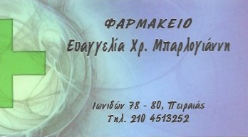 Φαρμακεία ΜΠΑΡΛΟΓΙΑΝΝΗ ΕΥΑΓΓΕΛΙΑ-ΦΑΡΜΑΚΕΙΑ ΠΕΙΡΑΙΑΣ Ιωνιδών 78-80 Πειραιάς Πληροφορίες Επιχείρησης: Ιωνιδών 78-80 Πειραιάς 18537 2104513252 35.2015175 24.1380312 383 Περιγραφή Επιχείρησης: ΜΠΑΡΛΟΓΙΑΝΝΗ ΕΥΑΓΓΕΛΙΑ Φαρμακείο