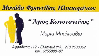 Οίκοι Ευγηρίας ΑΓΙΟΣ ΚΩΝΣΤΑΝΤΙΝΟΣ-ΟΙΚΟΙ ΕΥΓΗΡΙΑΣ ΕΛΛΗΝΙΚΟ Αφροδίτης 112 Ελληνικό Πληροφορίες Επιχείρησης: Αφροδίτης 112 Ελληνικό 16777 2109630362 6955808407 Κα Μαρία Μπαλτσαβιά 37.8952733 23.7606694 685 Περιγραφή Επιχείρησης: ΑΓΙΟΣ ΚΩΝΣΤΑΝΤΙΝΟΣ Οίκος Ευγηρίας