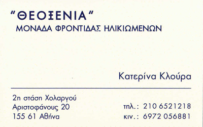 Οίκοι Ευγηρίας ΘΕΟΞΕΝΙΑ-ΟΙΚΟΙ ΕΥΓΗΡΙΑΣ ΧΟΛΑΡΓΟΣ Αριστοφάνους 20 Χολαργός Πληροφορίες Επιχείρησης: Αριστοφάνους 20 Χολαργός 15561 2106521218 6973056881 Κα Κλούρα Κατερίνα 35.2015175 24.1380312 678 Περιγραφή Επιχείρησης: ΘΕΟΞΕΝΙΑ Μονάδα Φροντίδα Ηλικιωμένων