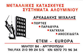Αλουμίνια ΑΡΚΑΔΑΚΗΣ ΜΙΧΑΗΛ-ΚΑΤΑΣΚΕΥΕΣ ΑΛΟΥΜΙΝΙΟΥ ΑΡΓΥΡΟΥΠΟΛΗ Μιλήτου 84 Αργυρούπολη Πληροφορίες Επιχείρησης: Μιλήτου 84 Αργυρούπολη 16452 2109924515 6972709634 35.2015175 24.1380312 308 Περιγραφή Επιχείρησης: ETEM - EUROPA Αρκαδάκης Μιχάλης ΜΕΤΑΛΛΙΚΕΣ ΚΑΤΑΣΚΕΥΕΣ- ΚΑΤΑΣΚΕΥΕΣ ΑΛΟΥΜΙΝΙΟΥ