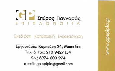 Ξύ/να δάπεδα-Ξυλ.κατασ/υές GP ΓΙΑΝΝΑΡΑΣ ΣΠΥΡΙΔΩΝ-ΕΡΓΟΣΤΑΣΙΟ ΕΠΙΠΛΩΝ ΜΟΣΧΑΤΟ Εμμανουήλ Καμπούρη 24 Μοσχάτο Πληροφορίες Επιχείρησης: Εμμανουήλ Καμπούρη 24 Μοσχάτο 18345 2109427154 6974603974 Κος Γιανναράς 37.9556849 23.6884704 929 Περιγραφή Επιχείρησης: GP ΣΠΥΡΟΣ ΓΙΑΝΝΑΡΑΣ Επιπλοποϊια
