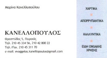 Χαρτικά-Απορρυπαντικά ΚΑΝΕΛΛΟΠΟΥΛΟΣ-ΧΑΡΤΙΚΑ ΑΠΟΡΡΥΠΑΝΤΙΚΑ ΠΕΙΡΑΙΑΣ Φρεαττύδος 5 Πειραιάς Πληροφορίες Επιχείρησης: Φρεαττύδος 5 Πειραιάς 18536 2104280022 Κος Κανελλόπουλος-Κα Μαρίνα 37.9348852 23.6420727 701 Περιγραφή Επιχείρησης: ΚΑΝΕΛΛΟΠΟΥΛΟΣ Χαρτικά-Απορρυπαντικά