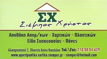 Χαρτικά-Απορρυπαντικά ΣΙΕΜΠΟΣ-ΑΠΟΘΗΚΗ ΧΑΡΤΙΚΩΝ ΙΛΙΟΝ Αλικαρνασσού 2 Ίλιον Πληροφορίες Επιχείρησης: Αλικαρνασσού 2 Ίλιον 13121 2105054629 Κος Σιέμπος 35.2015175 24.1380312 545 Περιγραφή Επιχείρησης: ΣΙΕΜΠΟΣ Αποθήκη Απορρυπαντικών Ίλιον Χαρτικά Πλαστικά Είδη Είδη Συσκευασίας Πάνες