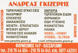 ΓΚΙΖΕΡΗΣ ΑΝΔΡΕΑΣ http://www.ydravlika-gizeris.gr/ Μελέτη-Εγκατάσταση Φυσικού Αερίου Υδραυλικές εγκαταστάσεις Καλοριφέρ Επισκευές Ανακαινίσεις Τοποθετήσεις ηλιακών-κλιματιστικών Εμπόριο Υδραυλικών ειδών Θέρμανση Είδη υγιεινής Κλιματιστικά Ηλιακά m nobel-maltezos stiebel-eltron